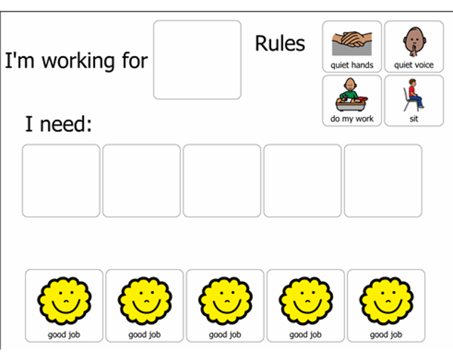 Next, identify some behaviors which you would like your child to engage in such as putting away their dishes, completing homework, sharing a toy with their sibling, eating all their dinner, etc. Once appropriate behaviors are identified, it may also be helpful to have a rules sheet indicating what behaviors will earn a token. Below is an example of behaviors that a child can engage in to earn tokens at school.