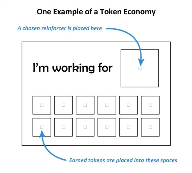 A token system or token economy is a method of positive reinforcement where an individual receives tokens for completing tasks or engaging in desired behaviors (Ayllon & Azrin, 1968). Token systems can be used to increase or strengthen behaviors by providing rewards or reinforcement when the targeted behaviors occur (Miltenberger, 2008). For example, when a child has received 10 tokens for engaging in desired behaviors such as completing their homework, taking out the garbage or cleaning their room, they are able to gain access to a preferred item or activity (e.g. bubbles, candy, iPad, etc.). Research shows that token systems are effective at increasing desired behaviors (Matson & Boisjoli, 2009).